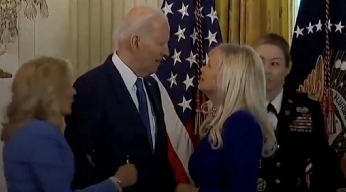 Bir süre kadınla el ele göz göze sohbet eden Biden’a karısı müdahale etti.