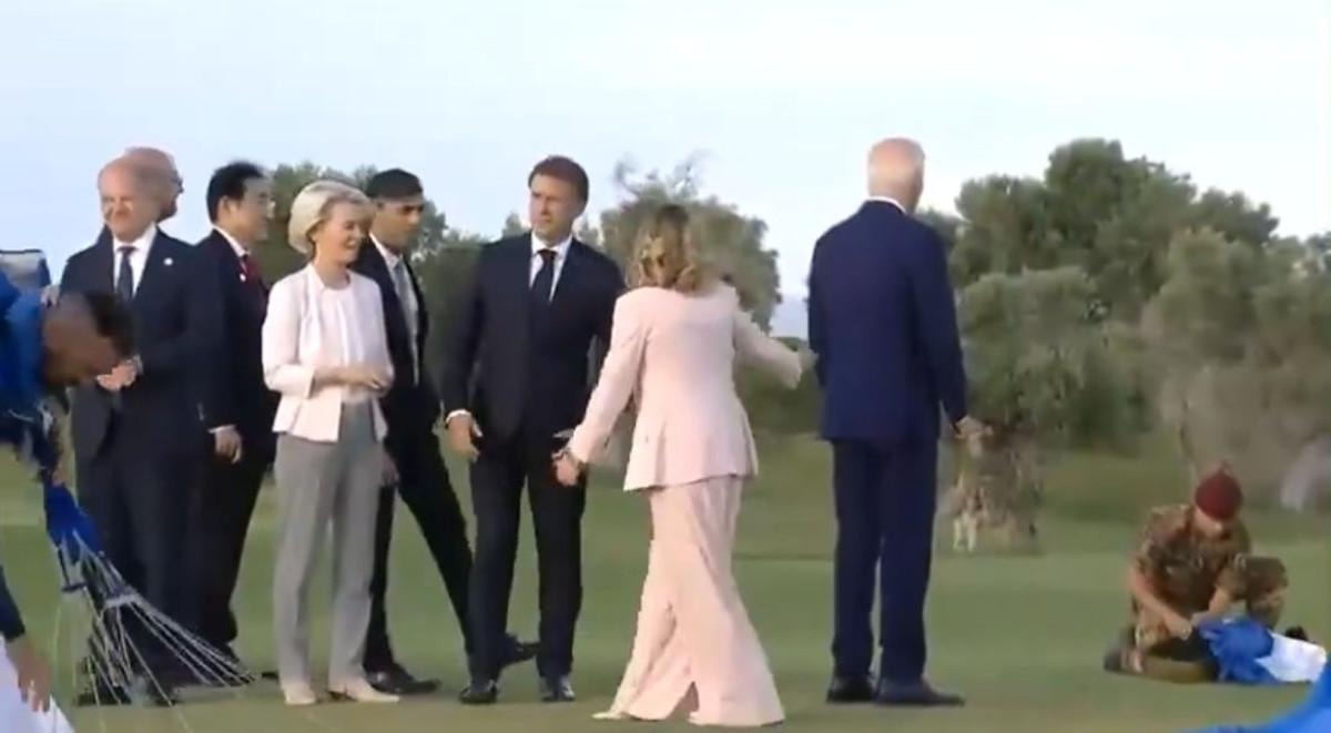 İtalya Başbakanı Giorgia Meloni, fotoğraf çekimi sırasında Biden’ın uzaklaştığını fark edince yanına gidiyor.