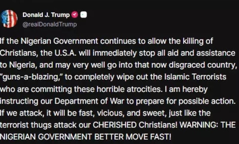 Kendisine ait Truth sosyal medya platformundan bir paylaşım yapan Trump, Nijerya hükümetinin Hristiyanların öldürülmesini engellemesi gerektiğini vurgulayarak, "Eğer Nijerya hükûmeti Hristiyanların öldürülmesine izin vermeye devam ederse, ABD derhal Nijerya'ya yapılan tüm yardım ve desteği kesecek. Ayrıca itibarını yitirmiş bu ülkeye silahlı müdahalede bulunarak bu korkunç zulümleri işleyen teröristleri tamamen yok edebiliriz" uyarısında bulundu.