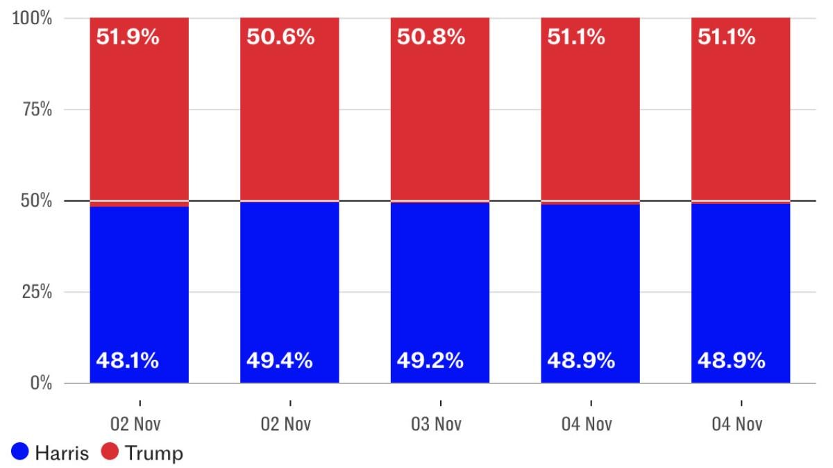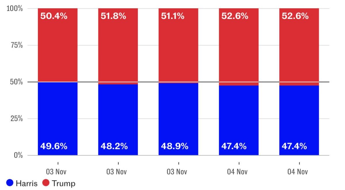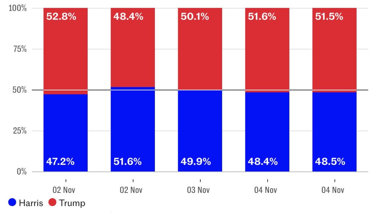 Seçime dair son anketlerin yapıldığı 4 Kasım'da Kamala Harris yüzde 51,4 öndeyken oran akşam saatlerinde değişti ve Donald Trump 50,5 oranına yükselerek liderliği ele aldı.