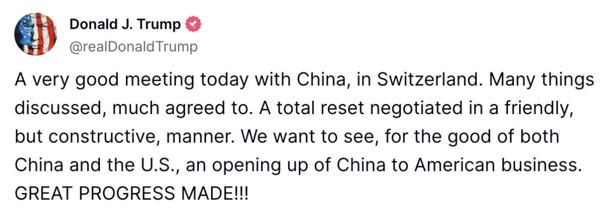 İsviçre'de Çin ile çok iyi bir toplantı gerçekleştirildiğini kaydeden Trump, "Pek çok şey görüşüldü, birçok konuda mutabık kalındı. Dostane ama yapıcı bir şekilde tam bir yeniden başlama süreci müzakere edildi." ifadelerini kullandı.