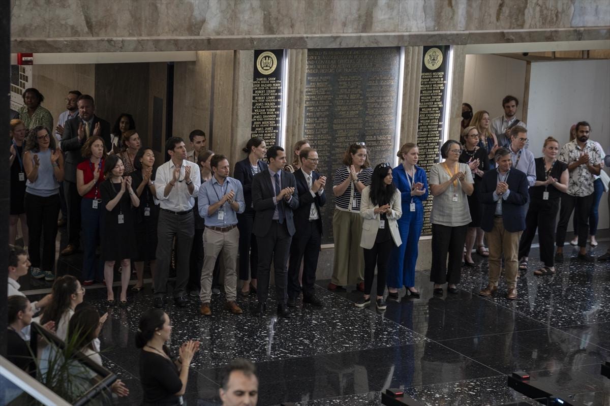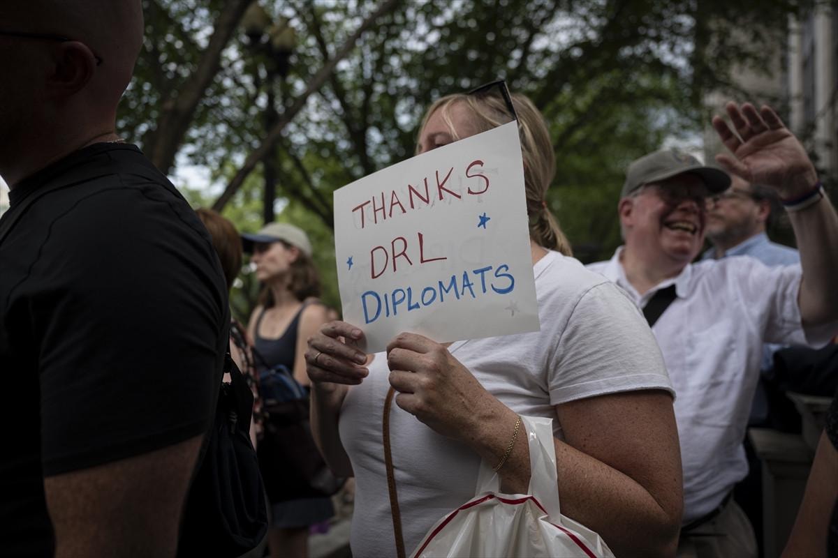 ABD Dışişleri Bakanlığı binası lobisinde ve kapı önünde toplanan personel, binayı ellerinde taşıdıkları kişisel eşyalarıyla terk eden arkadaşlarını alkışlayarak teselli etti.