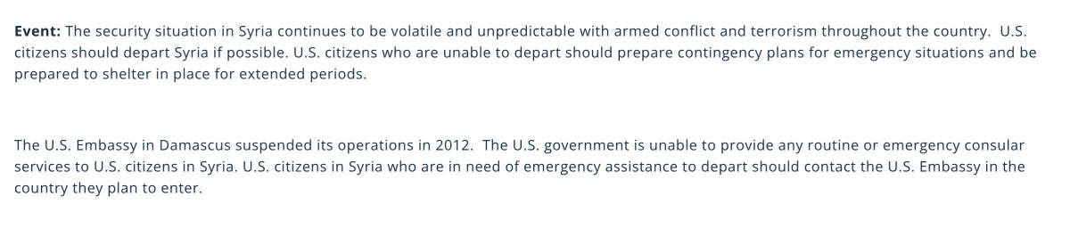 "Suriye'deki güvenlik durumu, ülke genelinde silahlı çatışma ve terörizmle birlikte değişken ve öngörülemez olmaya devam ediyor. ABD vatandaşları mümkünse Suriye'den ayrılmalıdır. Ayrılamayan ABD vatandaşları acil durumlar için acil durum planları hazırlamalı ve uzun süreler boyunca yerinde kalmaya hazır olmalıdır."