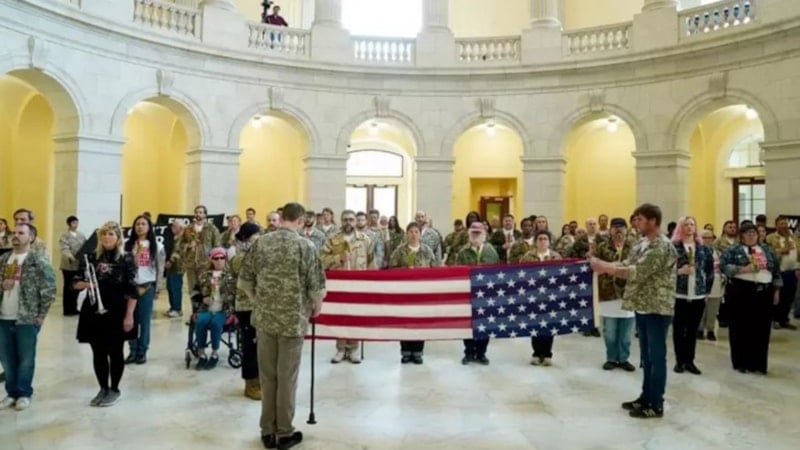 Protesto sırasında ABD milli marşı çalınırken, savaşta hayatını kaybeden askerler için saygı duruşunda bulunuldu ve sembolik bayrak katlama töreni gerçekleştirildi.