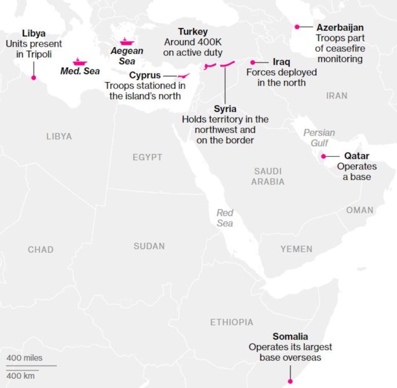 Türkiye'nin, Kuzey Kıbrıs Türk Cumhuriyeti'ndeki (KKTC) 50 yıllık askeri varlığının yanı sıra Orta Doğu'daki dört ülkede de güç bulundurduğu, Suriye ve Irak'taki operasyonlarını artırmayı planladığı vurgulandı.