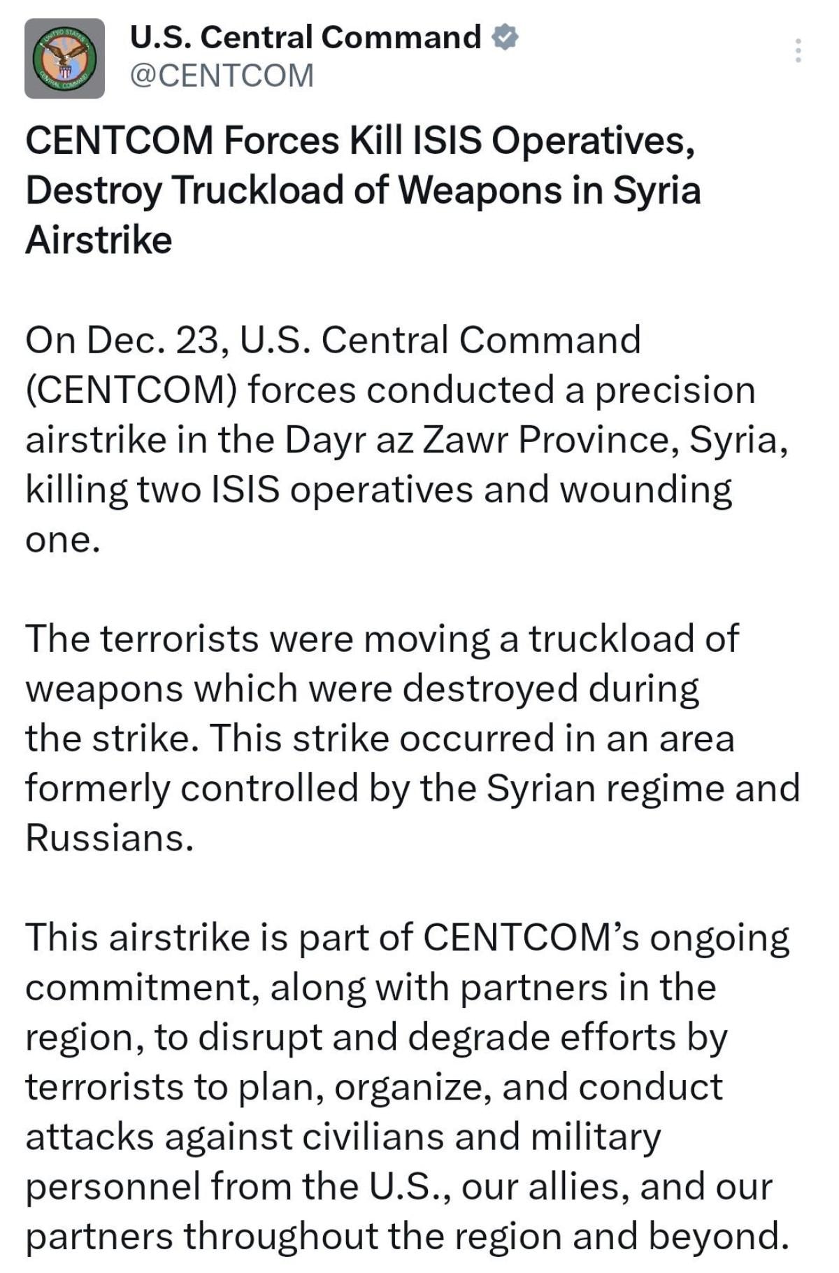 ABD Merkez Kuvvetler Komutanlığı (CENTCOM), Suriye'nin Dayr az Zawr bölgesinde bulunan bir DEAŞ hedefine yönelik hassas hava saldırısı gerçekleştirildiğini duyurdu.