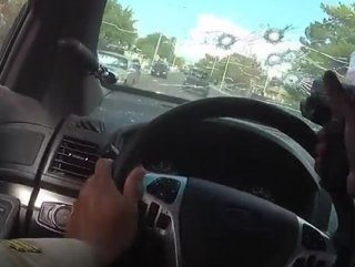 Yayınlanan görüntülerde bir polis, arabayla takip halinde olduğu, kendisine ateş edip kaçan cinayet şüphelilerine, polis aracının içinden ateş açtı.
