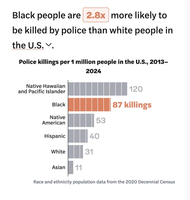 Her bir milyon kişi başına düşen polis şiddeti oranında, siyahiler 87 kişi ile önde gelirken bu oran beyazlar için 31'de kalıyor. En yüksek oran ise her bir milyon kişi başına 120 kişi ile Yerli Hawai ve Pasifik Adalılarında.