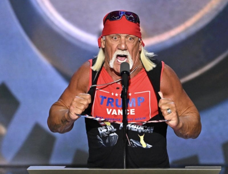 Eski profesyonel güreşçi ve oyuncu Hulk Hogan, Rutin gömleğini yırtma hareketini yaparak Trump'a olan desteğini açıkladı.