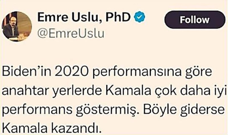 Firari örgüt mensubu Emre Uslu, 5 Kasım öncesinde Kamala Harrıs'in seçimi kazanacağı yönünde bir paylaşım yapmıştı. Seçim sonuçları açıklanmaya başlayınca ve sonuçlar beklentilerinin tersi çıkınca Emre Uslu, X paylaşımını hemen sildi.