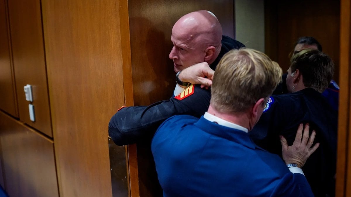 ABD Senatörü Tim Sheehy de polise yardım ederek protestocunun dışarı çıkarılmasına katıldı.