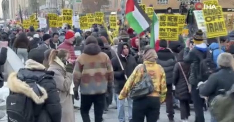 Polis tarafından trafiğe kapatılan ana güzergahlarda ilerleyen göstericiler, yürüyüş boyunca sık sık "ABD, İran'ın üzerinden elini çek", "İsrail, Orta Doğu'dan elini çek", "İran'dan şimdi elini çek" ve "İran'da savaş istemiyoruz" sloganları attı.