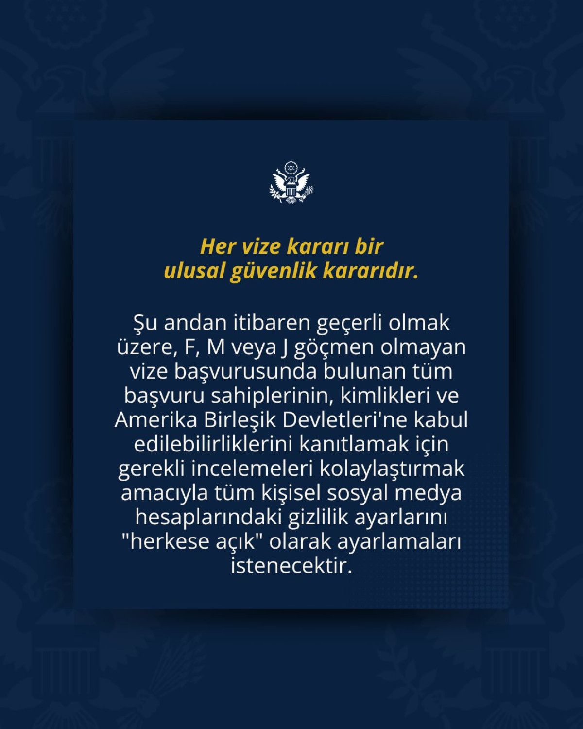 "Şu andan itibaren geçerli olmak üzere, F, M veya J göçmen olmayan vize başvurusunda bulunan tüm başvuru sahiplerinin, kimlikleri ve Amerika Birleşik Devletleri'ne kabul edilebilirliklerini kanıtlamak için gerekli incelemeleri kolaylaştırmak amacıyla tüm kişisel sosyal medya hesaplarındaki gizlilik ayarlarını 'herkese açık' olarak ayarlamaları istenecektir."
