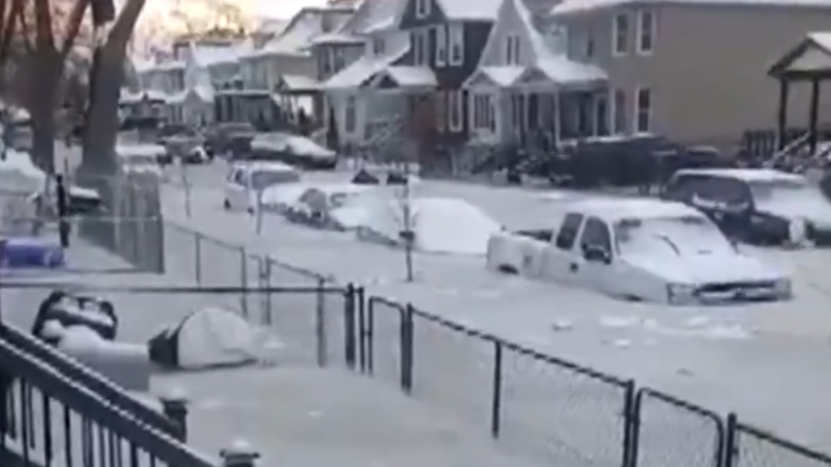 Henüz bilinmeyen bir nedenle yaşanan patlamanın ardından mahalle su altında kaldı. Hava sıcaklığının da -21’lere kadar düşmesi sonucu sokakları basan su dondu.
