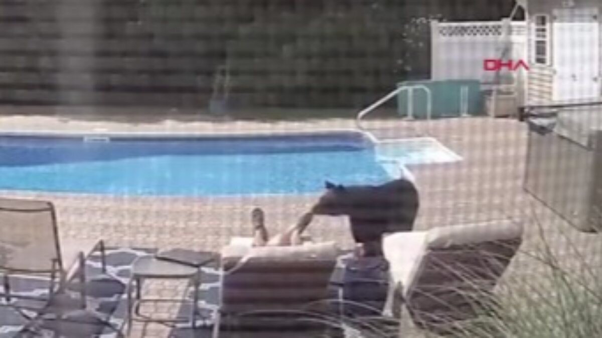Evin havuzuna doğru ilerleyen ayı önce havuza yönelip havuzdan su içti.