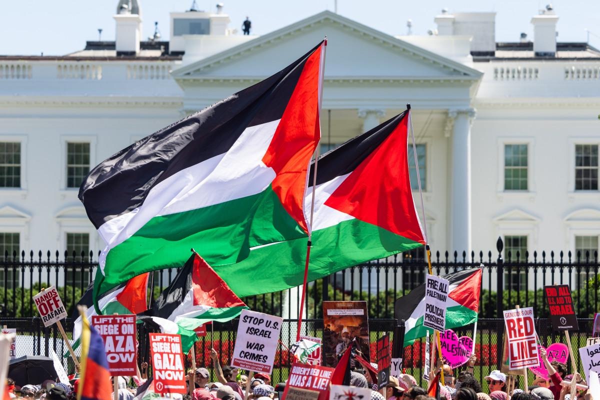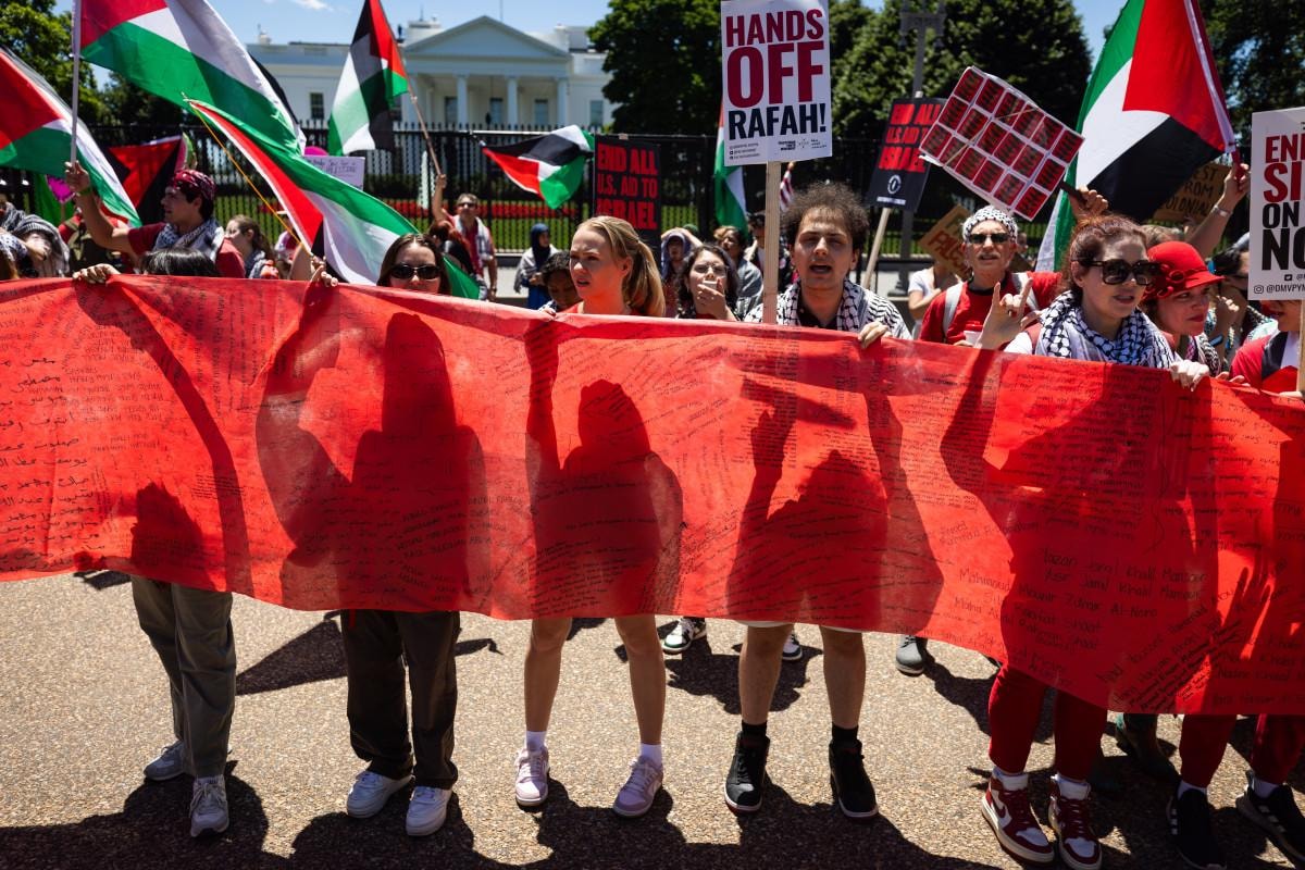 Binlerce Filistin destekçisi üzerinde hayatını kaybeden Filistinlilerin isimlerinin yazdığı dev kırmızı bir pankartla Beyaz Saray’ı kuşattı.