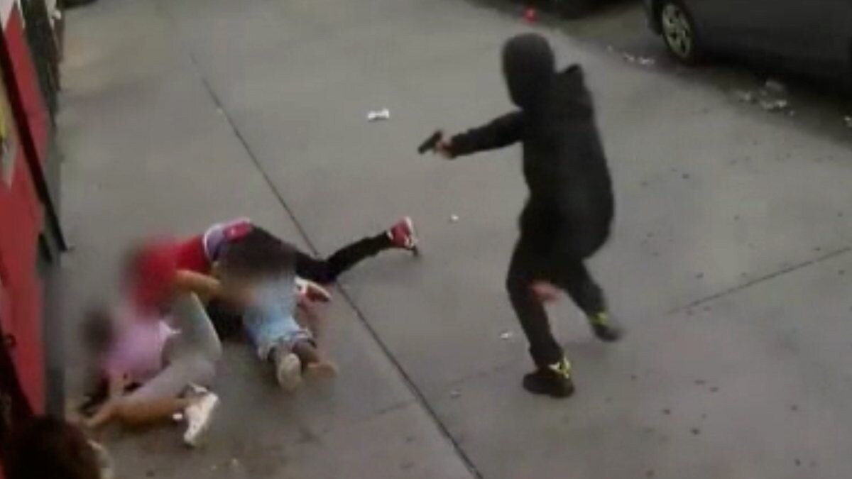 Bronx bölgesinde güvenlik kamerasına yansıyan olayda silahlı bir şahıs, kaldırımda kovaladığı 24 yaşındaki gence yakın mesafeden defalarca ateş etti. Bacaklarından ve sırtından vurulan genç, önünde bulunan 5 ve 10 yaşındaki iki kardeşin üzerine düştü. Saldırgan, çocuklara aldırış etmeden yerdeki gence kurşun yağdırmaya devam etti.