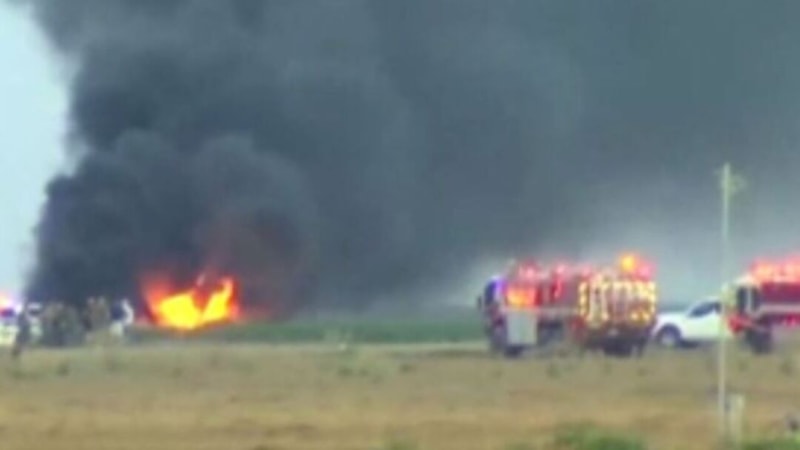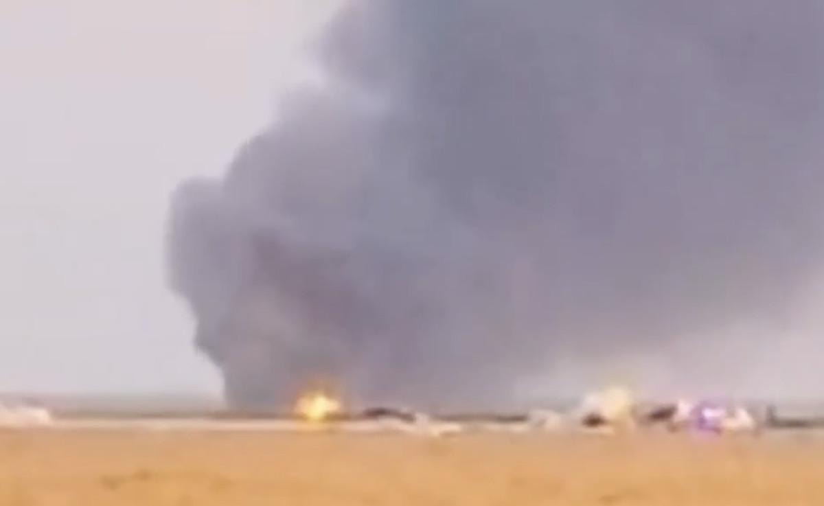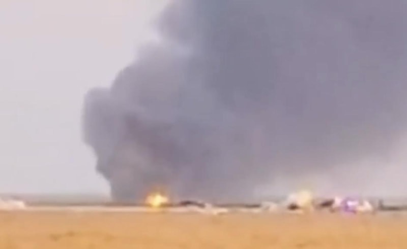 Olay yeri görüntülerinde, uçağın düştüğü açık alanda alev ve yoğun dumanın yayıldığı görüldü.