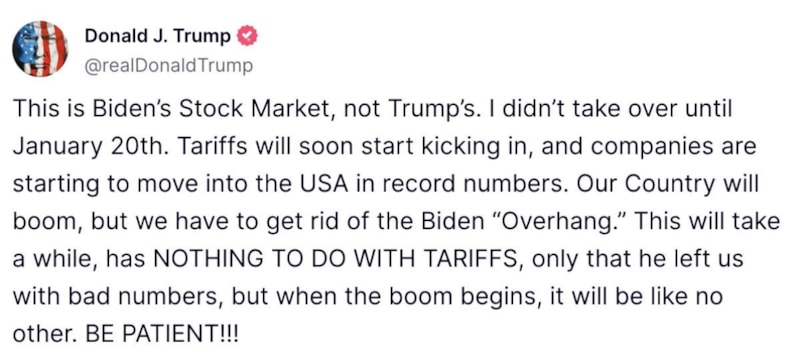 Paylaşımında "Bu Biden’ın borsası, Trump'ın değil." ifadesine yer veren Trump, kendisinin 20 Ocak'a kadar görevi devralmadığını anımsattı.
