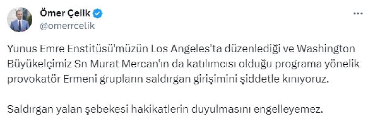 Yunus Emre Enstitüsü'müzün Los Angeles'ta düzenlediği ve Washington Büyükelçimiz Sn Murat Mercan'ın da katılımcısı olduğu programa yönelik provokatör Ermeni grupların saldırgan girişimini şiddetle kınıyoruz.
