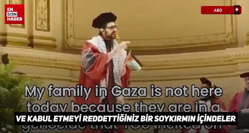 ABD'nin prestijli tıp fakültesindeki mezuniyet törenine, sahneye gelen Filistinli öğrencinin verdiği mesajlar damga vurdu.