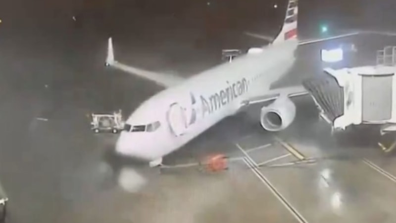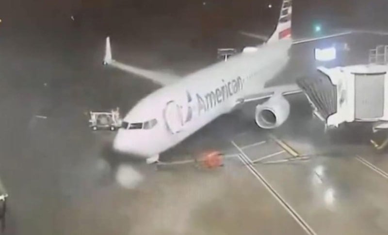 ABD'de Texas eyaletinde etkili olan olumsuz hava koşulları hayatı etkilemeye devam ediyor. Dallas Fort Worth Havalimanı'nda American Airlines'a ait park halindeki yolcu uçağı fırtınanın etkisi ile körükten kurtularak döndü.
