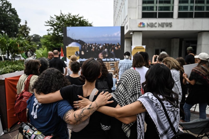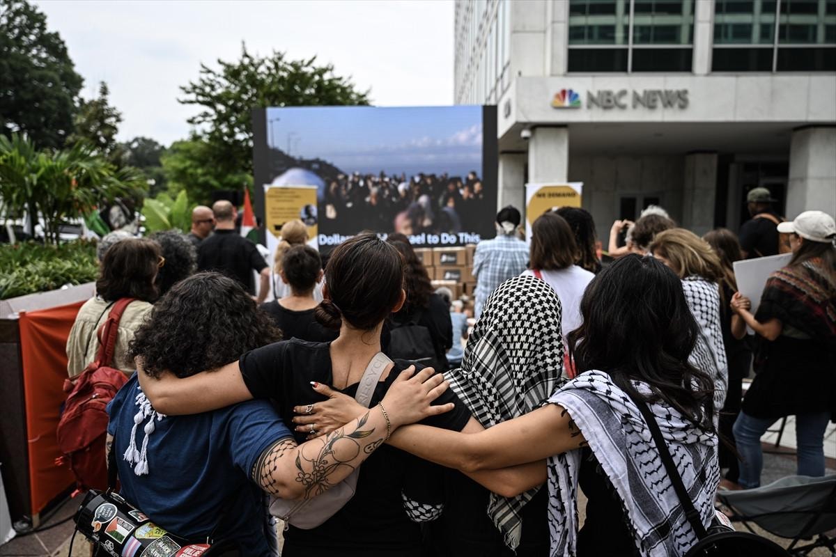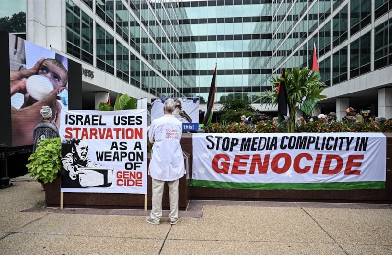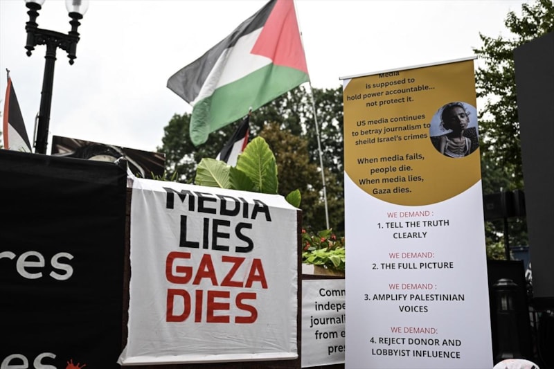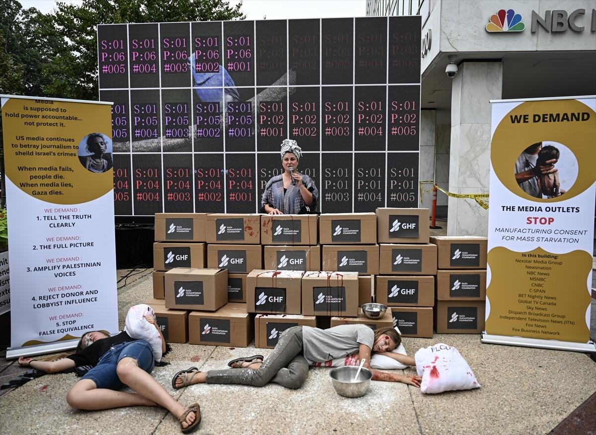ABD medyasında İsrail'in Gazze'ye saldırılarına ilişkin haberlerin taraflı olmasını protesto eden göstericiler, "Soykırıma medyanın suç ortaklığını durdurun." ve "Medya yalan söylüyor, Gazze ölüyor." yazılı dövizler taşıdı.