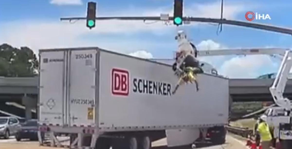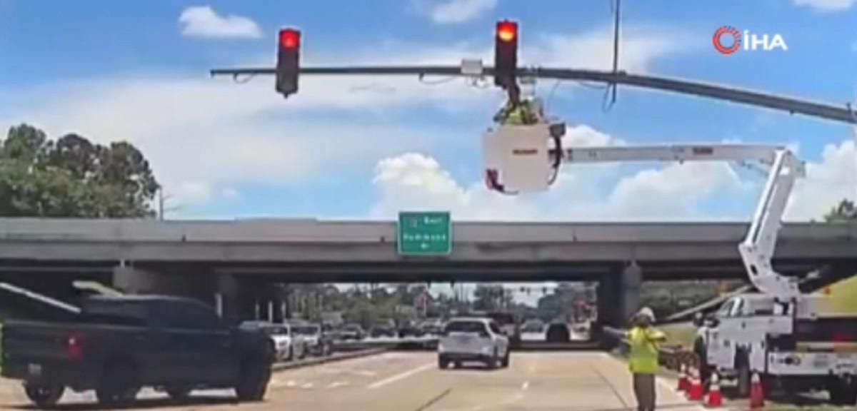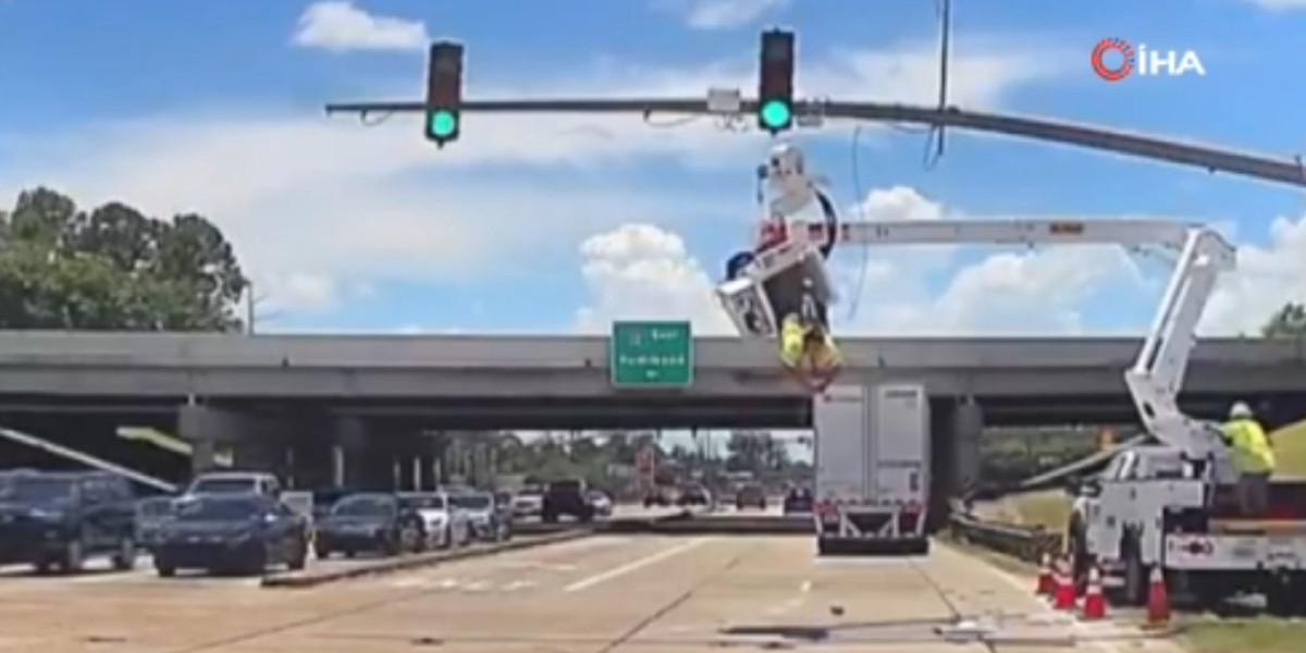 Livingston Parish bölgesindeki bir otoyolda seyreden tır, sepetli vinç üzerinde trafik ışığı bakımı yapan bir elektrik işçisine çarptı.