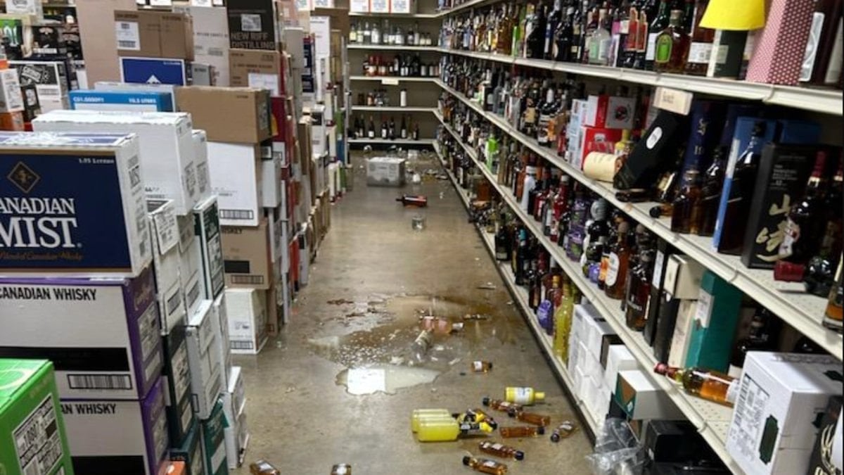 Ortalığı birbirine katan rakun dükkanda şişeleri parçaladı, tavan döşemesini çökertti ve her tarafa içkiler döktü.