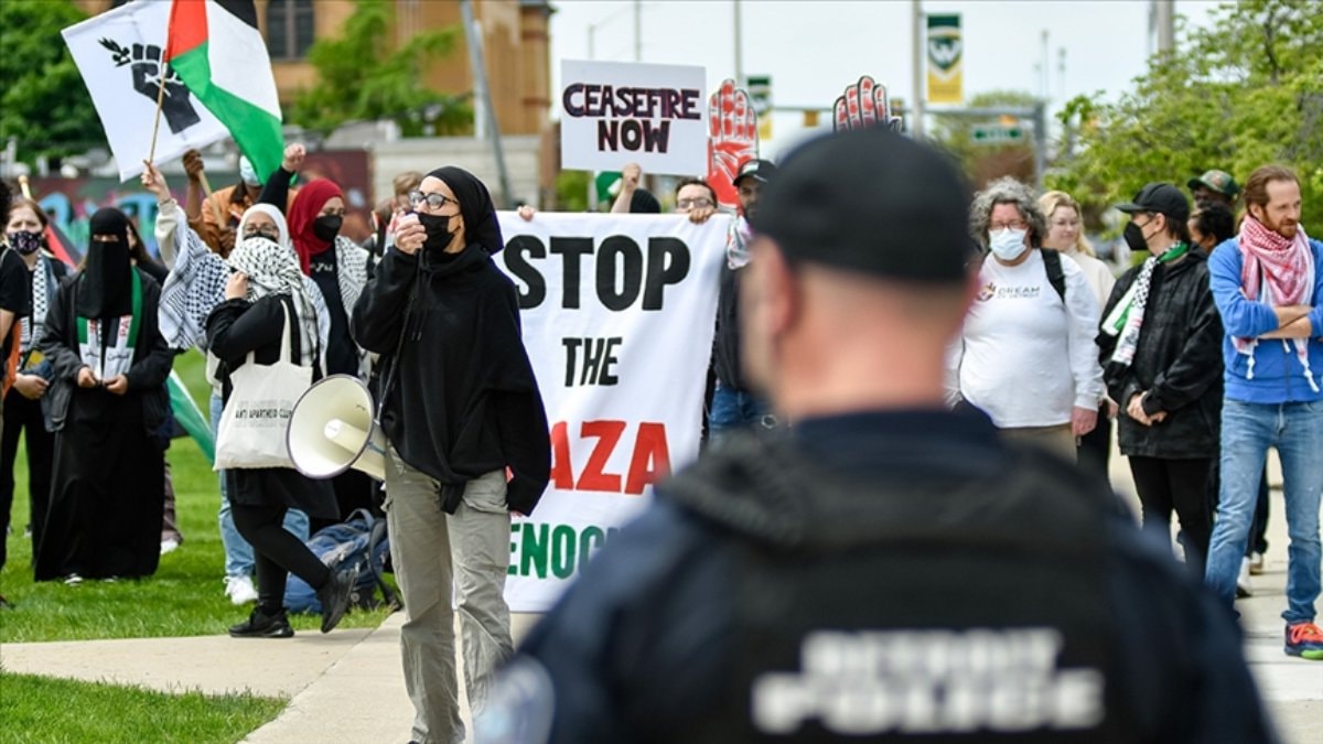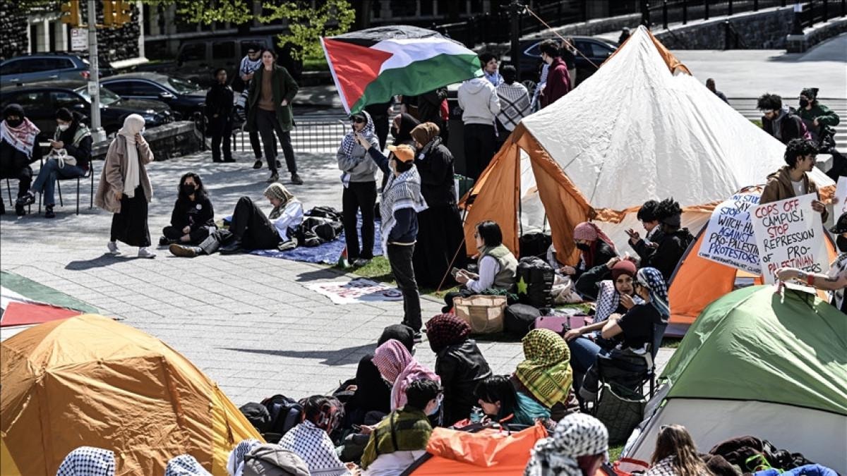Okul kampüsünde 8 çadırla Filistin'e destek kampı kuran yüzlerce öğrenci, saatler süren protestoları sırasında "buradayız ve geceyi burada geçireceğiz" diye bağırmıştı.