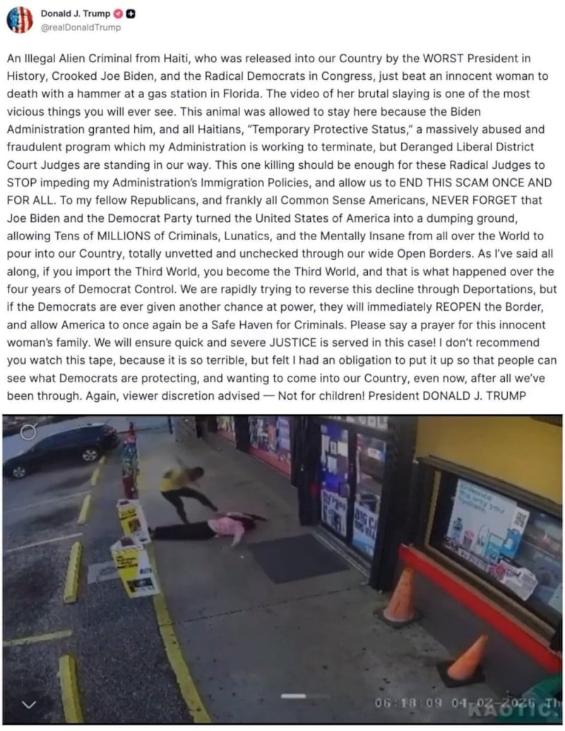 ABD'de yaşanan bir şiddet olayını hatırlatan Trump, "Tarihteki en kötü başkan olan sahtekar Joe Biden ve ABD Kongresi'ndeki radikal Demokratlar tarafından ülkemize salıverilen Haitili yasa dışı göçmen bir suçlu, Florida'daki bir benzin istasyonunda masum bir kadını çekiçle döverek öldürdü. Onun vahşice katledilişinin videosu, görebileceğiniz en gaddarca şeylerden biri." ifadelerini kullandı.