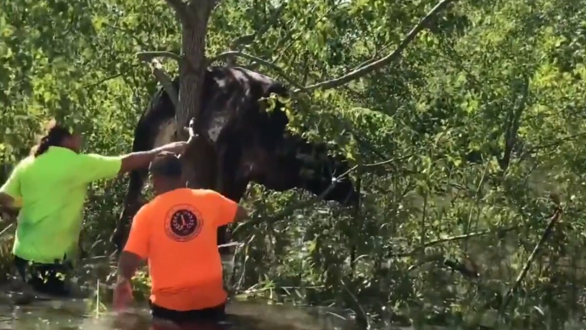 Bir inek de, kasırgayla birlikte ağacın tepesinde asılı kaldı. İneğin kurtarılma anı ise kamera ile kayıt altına alındı.