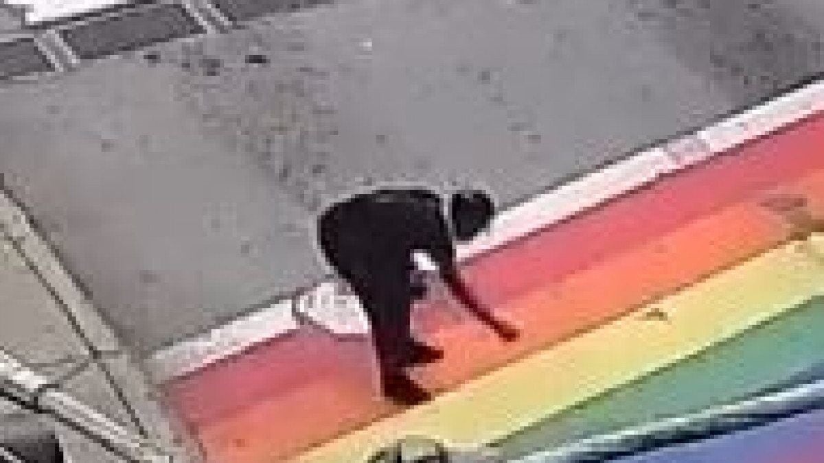 “Gökkuşağı Yaya Geçidini tahrip etmekten sorumlu kişiyi gözaltına almaya çalışırken polisin halkın yardımına ihtiyacı var. Şüpheli, Piedmont Ave'deki 10'uncu Caddeki LGBTQ Rainbow Crosswalk Landmark'a sprey boyayla bir gamalı haç çizdi.”