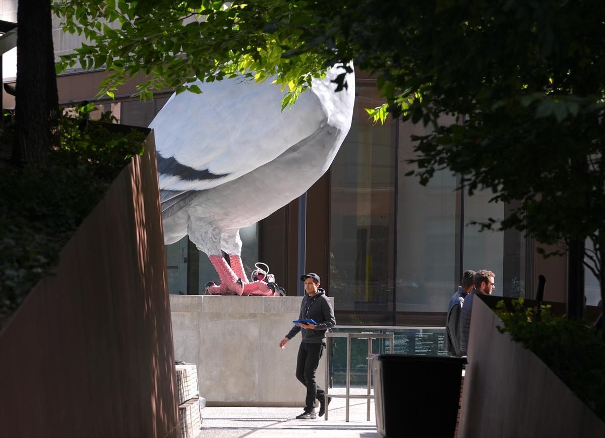 Ancak bu kez heykel, bu anlatıyı tersine çeviriyor; çünkü Dinozor isimli bu kuş, araçların ve geçenlerin üzerinde yükselerek pasif bir egemenlik oluşturuyor.