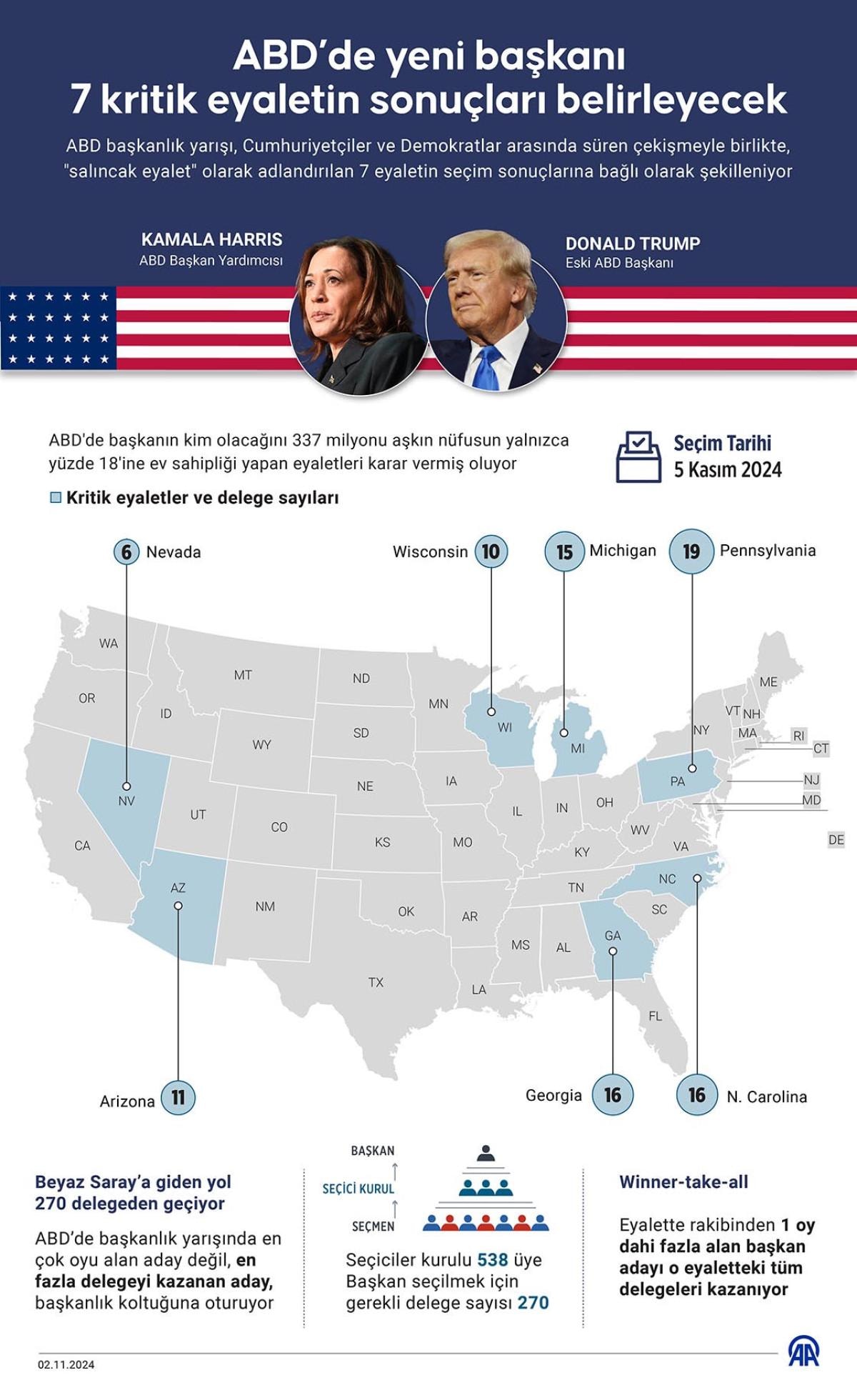 2024 başkanlık seçimlerinde herkesin gözü Pensilvanya, Georgia, Arizona, Nevada, Michigan, North Carolina ve Wisconsin eyaletlerinde. 270 delegeye ulaşan adayın başkanlığı kazandığı ABD'de, salıncak eyaletlerin toplam 93 delegesi bulunuyor.