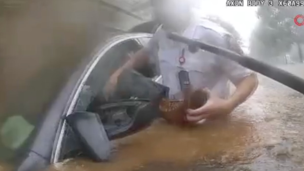 Caddedeki bir aracın yarıya kadar sel suyuna gömüldüğünü fark eden polis, sürücüyü kurtarmak için beline kadar gelen suya girdi.