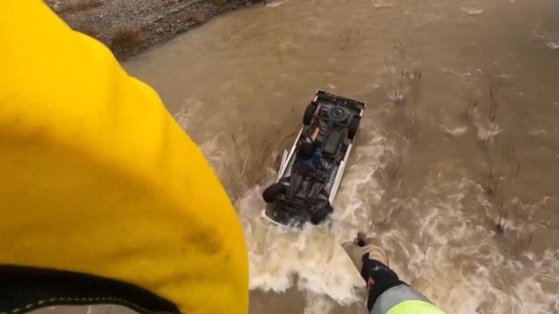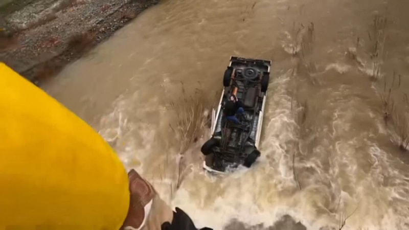 Hızlı akan bir deredeki yolu geçmeye çalışan kadın sürücü, aracıyla sürüklenerek mahsur kaldığı derede 15 saat boyunca kurtarılmayı bekledi. Ekiplerin sürücüyü helikopterle kurtardığı görüntüler kameraya yansıdı.