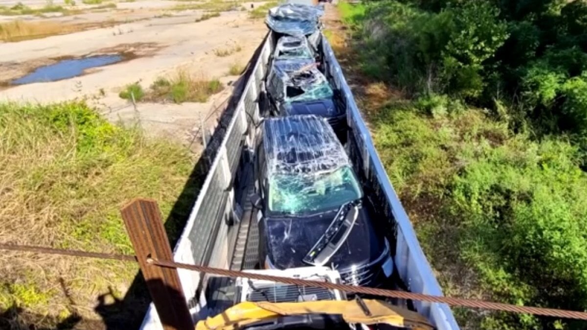Amerika’da Ford ve Lincoln marka sıfır otomobilleri taşıyan tren, köprüye çarptı.