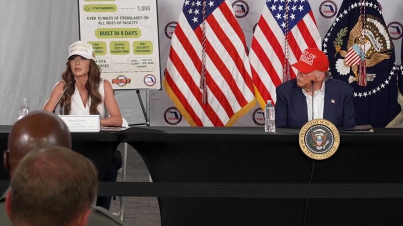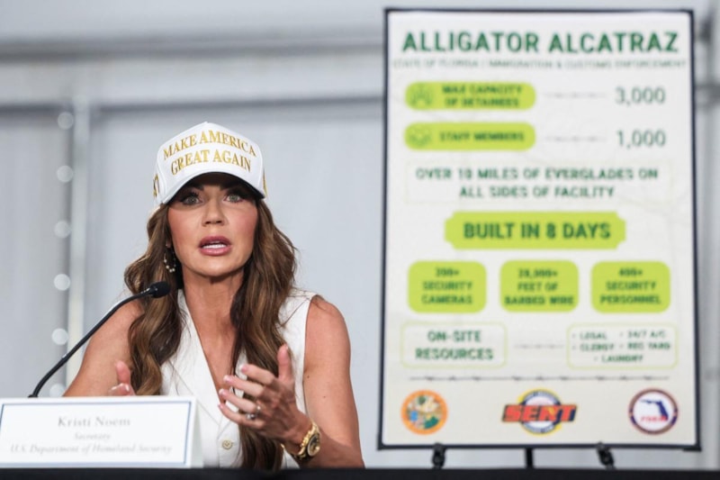 ABD İç Güvenlik Sekreteri Kristi Noem, Florida Everglades’te yeni açılan “Alligator Alcatraz” adlı göçmen gözaltı merkezini Başkan Donald Trump ile beraber gezdi.