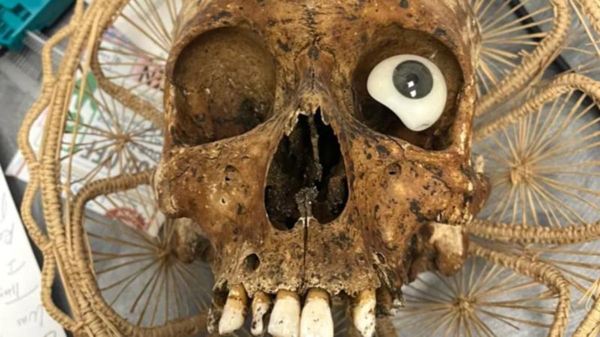 Üst çenesindeki dişlerden bazıları yerinde duran, lekelerle kaplı kafatasının sol göz çukuruna sahte göz yerleştirilmiş olması dikkati çekti.