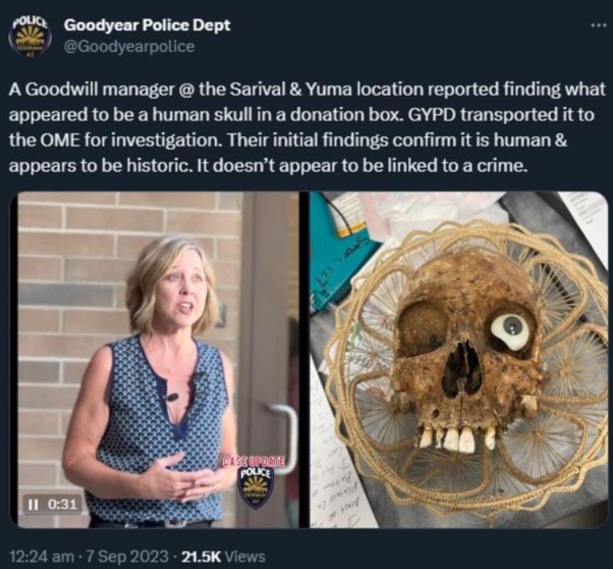 Polis Sözcüsü Lisa Berry, Maricopa Bölgesi Adli Tabip Ofisi'ndeki ilk incelemede "gerçekliği teyit edilen" kafatasının oldukça eski olduğunun ve hiçbir suçla bağlantılı bulunmadığının belirlendiğini, adli açıdan önem arz etmediğini açıkladı.