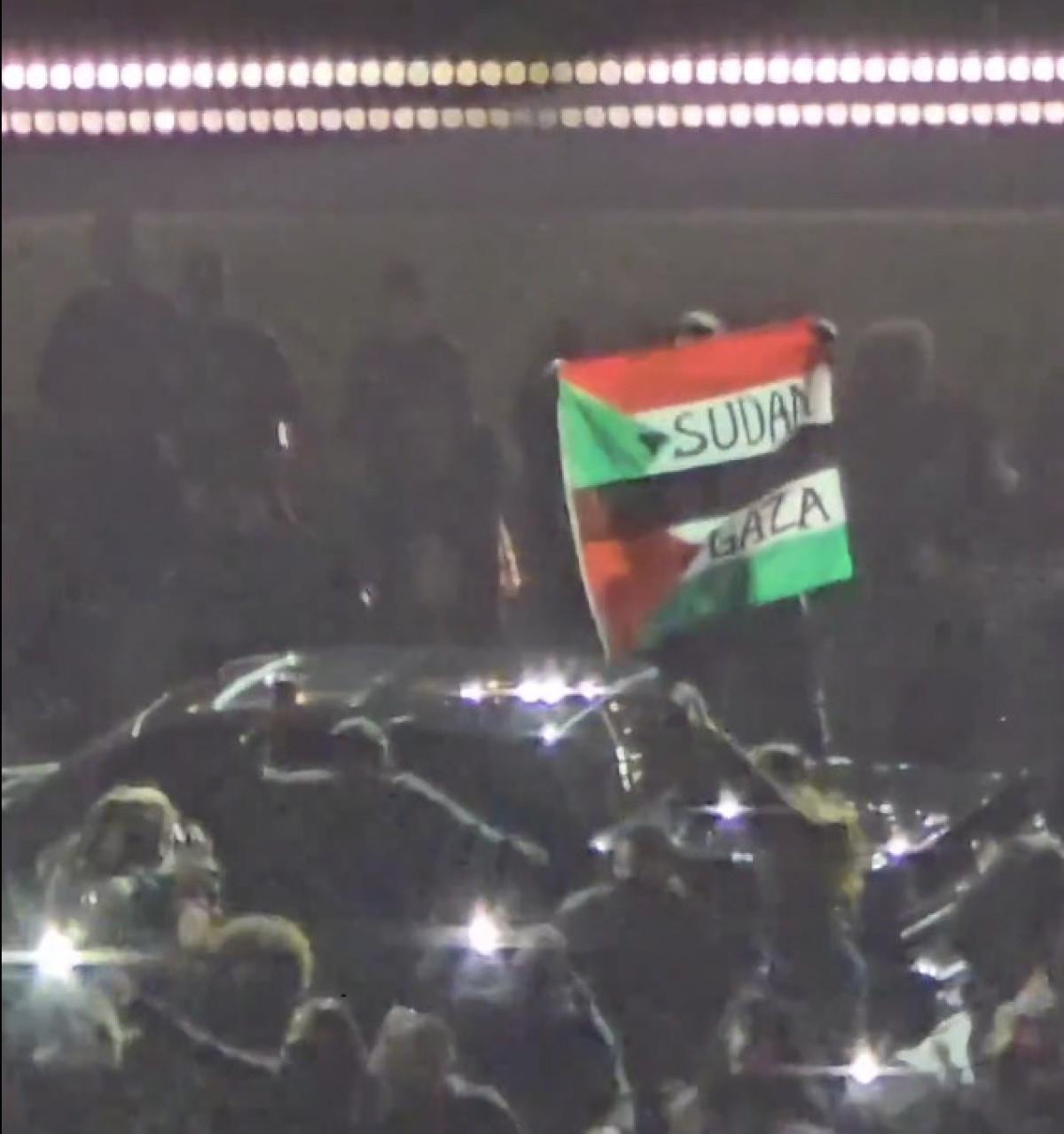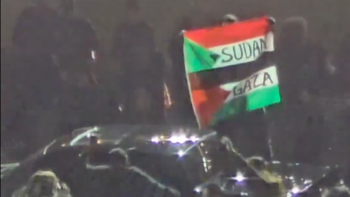 Elinde Sudan ve Filistin bayrağı olan kişi, Sudan'daki savaşı ve İsrail'in Gazze'ye saldırılarını protesto etti.