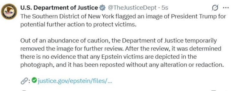 ABD Adalet Bakanlığı’ndan yapılan açıklamada ise, yayınlanan Epstein belgeleri arasında yer alan ve Trump’ın görüldüğü bir görselin inceleme için geçici olarak yayından kaldırıldığı belirtilerek, "İnceleme sonrasında, fotoğrafta Epstein kurbanlarından herhangi birinin görüldüğüne dair bir kanıt bulunmadığı belirlendi ve fotoğraf herhangi bir değişiklik veya sansür yapılmadan yeniden yayınlandı" denildi.