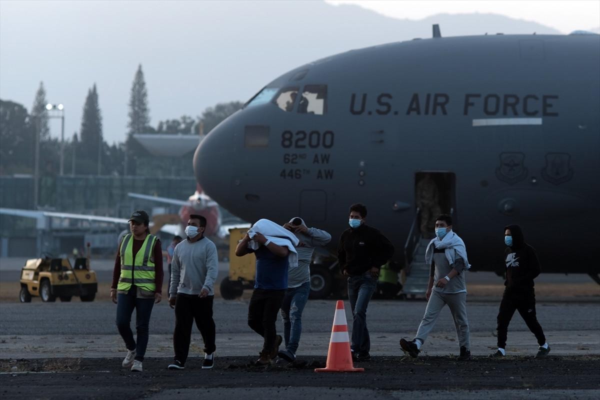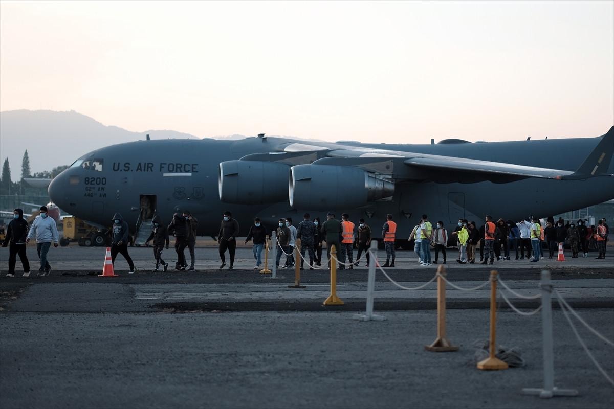 Sınır dışı edilen bir grup göçmen, ABD hava kuvvetlerine ait askeri uçak ile Orta Amerika ülkesi Guatemala'daki La Aurora Uluslararası Havaalanı'na geldi.
