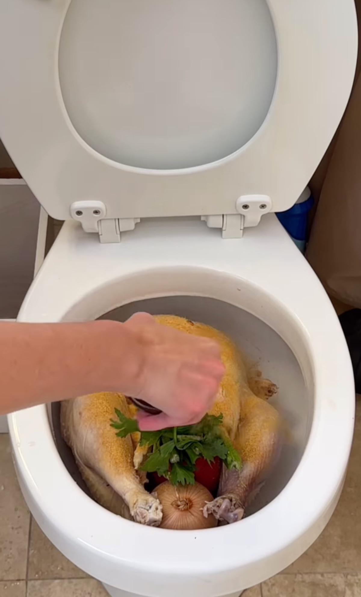 Çiğ hindiyi klozetin içine koyarak soslayan ve iç harcını yerleştiren fenomen, bu anları kaydederek hesabında paylaştı.