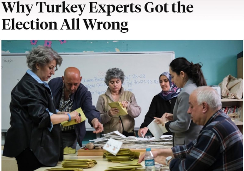 "Türkiye uzmanları seçimi neden yanlış anladı?" sorusunun yöneltildiği yazıda, Cumhurbaşkanı Recep Tayyip Erdoğan'ın "beklenenden daha iyi performansının, umudun analiz olmadığını hatırlattığı" kaydedildi.