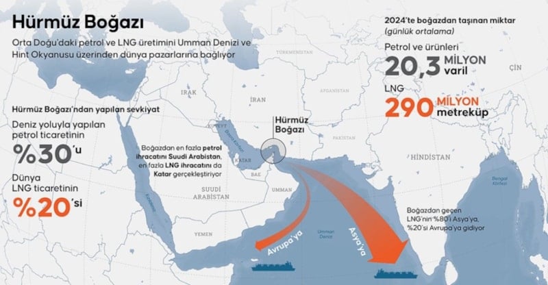 Basra Körfezi'nin çıkışında yer alan Hürmüz Boğazı, Orta Doğu'daki petrol üretimini Umman Denizi ve Hint Okyanusu üzerinden dünya pazarlarına bağlıyor. Geçen yıl Boğaz'dan günlük ortalama 15 milyon varil ham petrol ve 5 milyon varil petrol ürünü sevk edildi. Bu da Hürmüz üzerinden geçen toplam hacmin günlük yaklaşık 20 milyon varile ulaştığını gösteriyor.