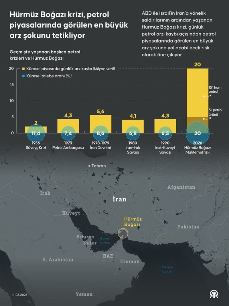 Boğazdaki petrol akışını aksatan mevcut krizin devam etmesi durumunda küresel petrol talebinin yaklaşık yüzde 20'sini oluşturan arzın fiilen etkileneceği hesaplanıyor. Bu büyüklükte bir kesintinin modern petrol piyasalarında bugüne kadar görülen tüm arz şoklarını geride bırakabileceği değerlendiriliyor.