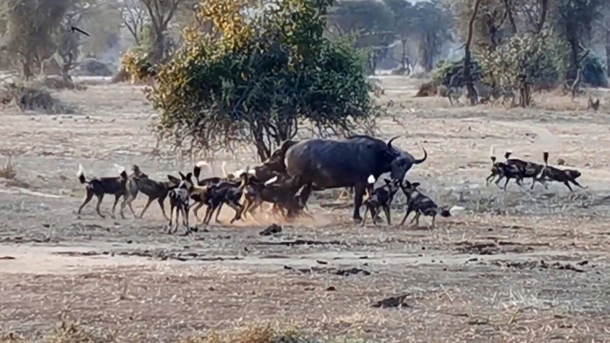 Köpekler, peşi sıra yetişkin hayvana saldırarak avlamaya çalıştı. Bufalo, bir süre sonra saldırıya karşı koyacak gücünü kaybetti.