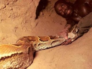 Afrika'da yumurtalarını yerin altındaki tünele bırakan pitonlar, özellikle kavurucu sıcaklarda gündüzleri deliklerinden dışarıya çıkmaz. Afikalı avcılar, Bu deliklerin birisinde bulunan dev pitonu avlamak için harekete geçti.